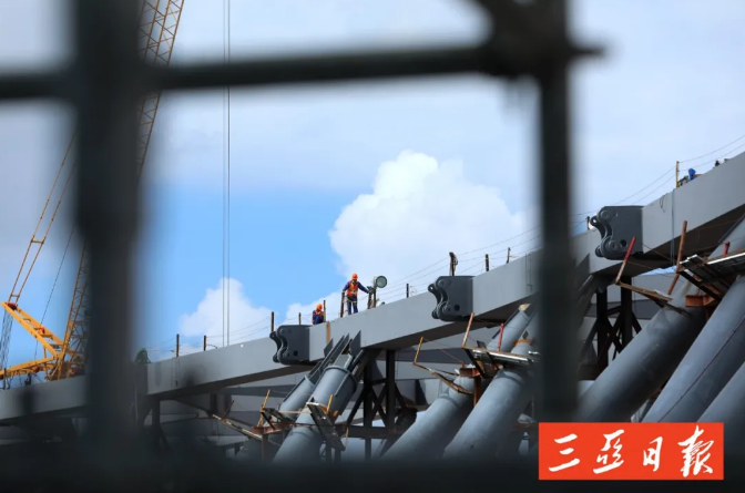 5月31日上午,三亚市体育中心体育场项目钢结构最后一根钢构件完成吊装,标志着体育场项目取得了阶段性胜利。
