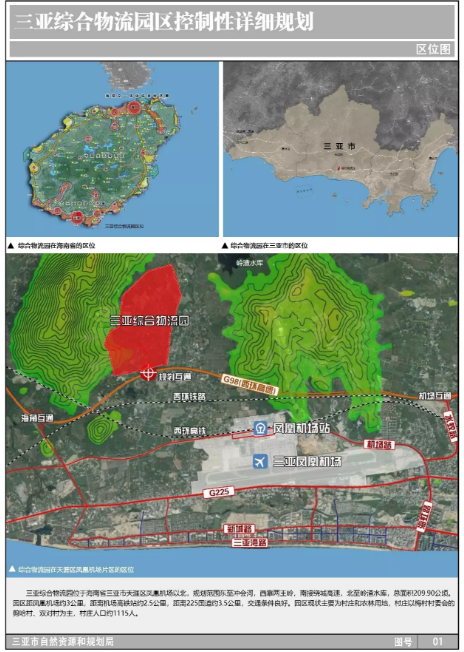 根据规划,三亚综合物流园位于三亚市天涯区凤凰机场以北,规划范围西至两王岭,东至冲会河,南至绕城高速,北至岭渣水库,面积约209.9公顷。该物流园紧扣海南自由贸易港和三亚空港型国家物流枢纽承载城市建设要求,依托毗邻凤凰机场和绕城高速的区位优势,重点开展自贸物流、空港物流、高附加值城市配套物流、高附加值和无污染的高端制造加工业,打造三亚市重要物流节点。